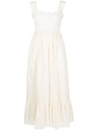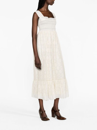 broderie anglaise cotton midi dress Intricate floral and Double G-patterned broderie anglaise lend this cotton dress from Gucci a subtle branded look. It's cut with a smocked bodice and ruffle trim, nodding to the brand's AW23 whimsical mood. Highlights - Cream white - Cotton - Broderie anglaise - Signature double g logo - Square neck - Wide shoulder straps - Smocked panel - Flared skirt - Ruffle hem - Mid-length Made in Italy Composition Cotton 100% SIZE & FIT Model measurements Height 5 ft 11 in(1.8 m) Bust/Chest 34.25 in(87 cm) Hips 35.82 in(91 cm) Waist 24.8 in(63 cm) Measurement LENGTH 50.39 in(128 cm) WAIST 25.98 in(66 cm) BUST 27.55 in(70 cm) FittingInformation Designed for a close fit at the chest and waist with a loose fit at the hip The elasticated waist allows for a comfortable fit Made from a midweight non-stretch fabric This piece fits true to size – take your usual size