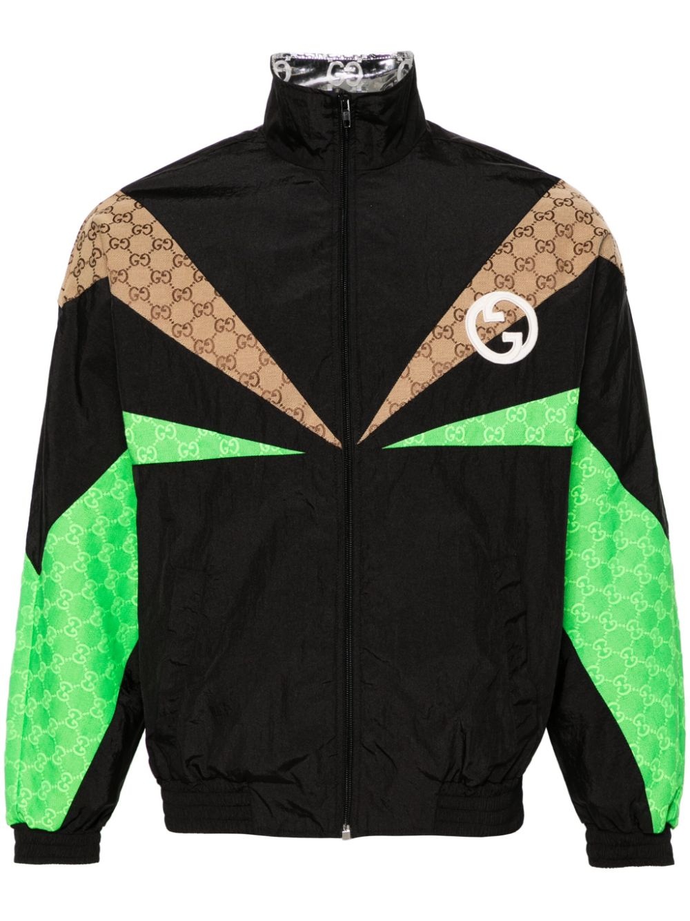 panelled GG canvas bomber jacket Gucci modernizes the classic GG Monogram with this bomber jacket, constructed in a panelled design with bright green accents. Crafted from technical fabric, it's complete with a contrasting silver collar lining. Highlights - Black/multicolour - Colour-block panelled design - Classic gg canvas - Signature interlocking g logo patch at the chest - Mock neck - Front zip fastening - Long sleeves with elasticated cuffs - Two side slit pockets - Mesh lining and silver-tone laminated gg lining - Elasticated hem Made in Italy Composition Outer: Polyamide 100%, Cotton 70%, Polyester 30% Lining: Polyester 100% SIZE & FIT Model measurements Height 5 ft 10 in(1.77 m) Bust/Chest 32.28 in(82 cm) Hips 35.03 in(89 cm) Waist 25.19 in(64 cm) FittingInformation Designed for a relaxed fit, this piece allows for comfort and movement when worn The elasticated hem allows for movement and a comfortable fit Made from a midweight non-stretch fabric This piece fits true to size – take your usual size Washing instructions Dry Clean Only