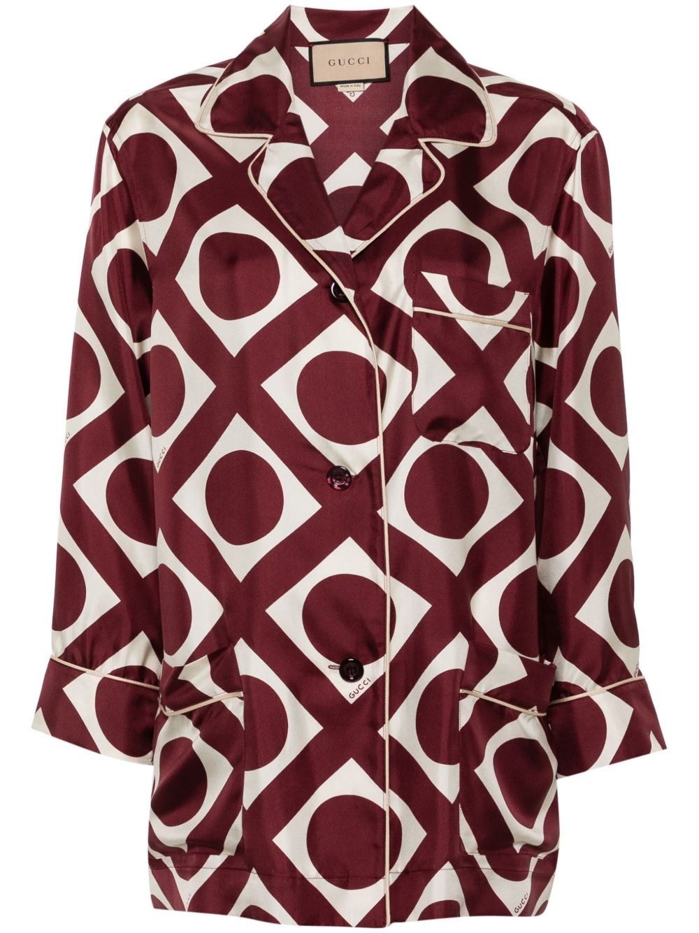 graphic-print shirt Highlights - Bordeaux red/white - Silk - Satin weave - All-over graphic and logo print - «piped-trim detailing - Camp collar - Front button fastening - Long sleeves - Three front patch pockets - Straight hem Made in Italy Composition Cotton 100%, Silk 100% SIZE & FIT Model measurements Height 5 ft 9 in(1.76 m) Bust/Chest 31.88 in(81 cm) Hips 35.43 in(90 cm) Waist 24.8 in(63 cm) FittingInformation Designed to be unstructured, offering a loose fit throughout Made from a lightweight non-stretch fabric This piece fits true to size – take your usual size