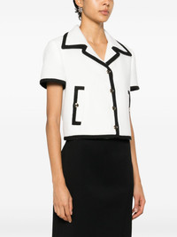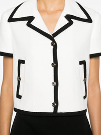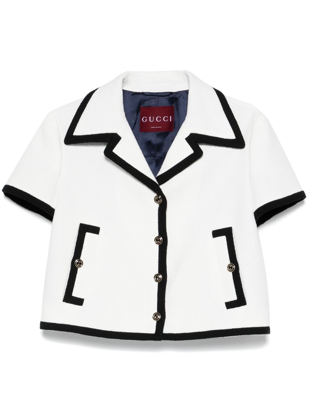 tweed jacket Highlights - White/black - Cotton blend - Tweed - Contrasting trim - Signature interlocking g-logo buttons - Notched lapels - Short sleeves - Two front welt pockets - Straight hem - Full lining - Front button fastening Made in Italy Composition Lining: Viscose 100%, Cupro 100% Outer: Cotton 91%, Polyamide 9% SIZE & FIT Model measurements Height 5 ft 9 in(1.76 m) Bust/Chest 31.88 in(81 cm) Hips 35.43 in(90 cm) Waist 24.8 in(63 cm) FittingInformation Designed for a relaxed fit, this piece allows for comfort and movement when worn Made from a midweight non-stretch fabric This piece fits true to size – take your usual size