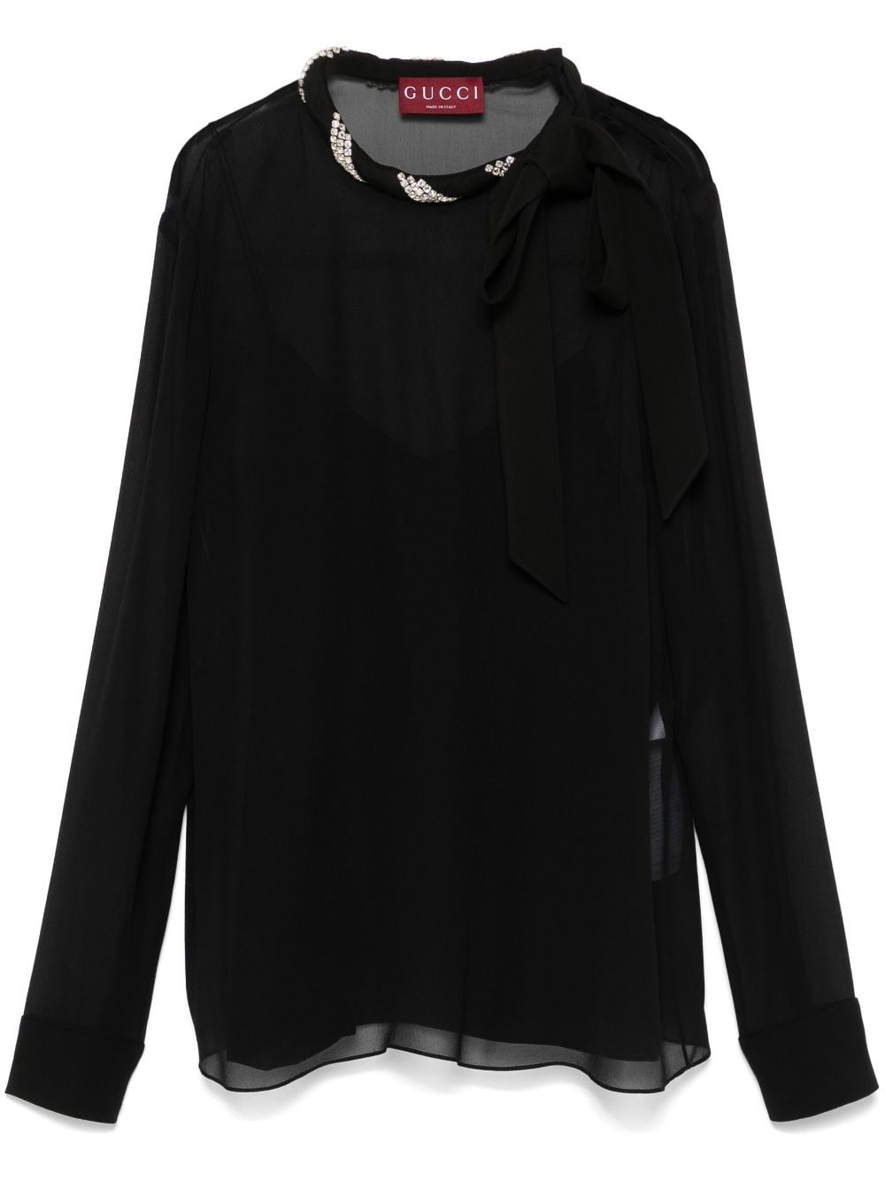 crystal-embellished blouse Highlights - Black - Georgette crepe - Semi-sheer construction - Crystal embellishment - Button fastening at the shoulder - Round neck - Scarf detailing - Long sleeves - Buttoned cuffs - Partial lining - Straight hem Made in Italy Composition Acetate 75%, Silk 25% SIZE & FIT Model measurements Height 5 ft 10 in(1.78 m) Bust/Chest 33.46 in(85 cm) Hips 36.22 in(92 cm) Waist 23.22 in(59 cm) FittingInformation Designed to be unstructured, offering a loose fit throughout The detachable slip sits just away from the body, offering a close yet comfortable fit Made from a lightweight non-stretch fabric