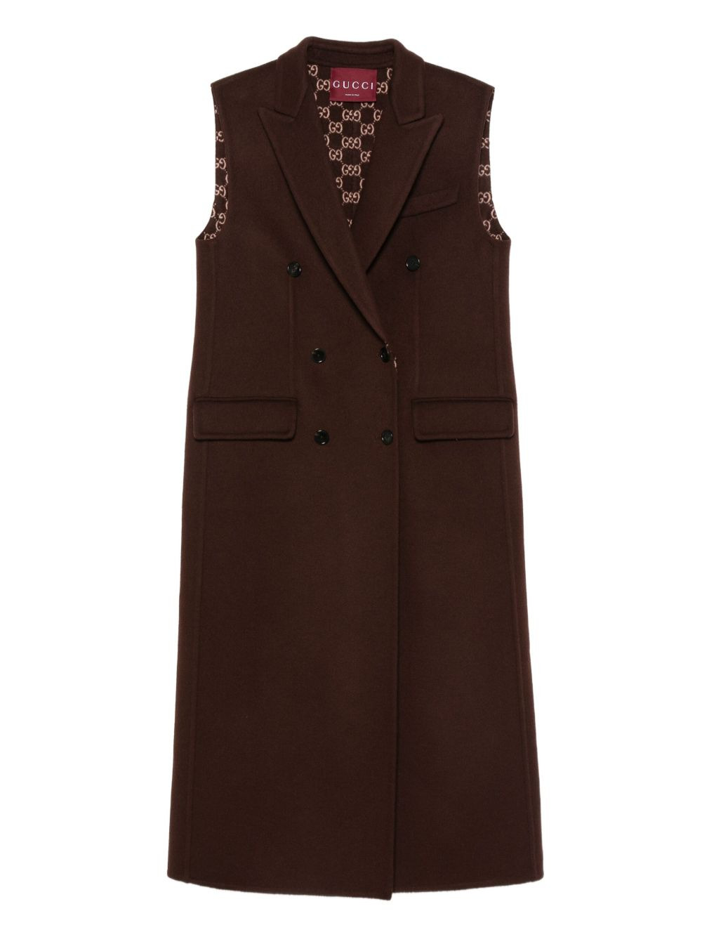 double-breasted sleeveless coat Highlights - Brown - Double-breasted fastening - Gg-logo pattern - Sleeveless - Wool-silk blend Made in Italy Composition Outer: Wool 99%, Silk 1% Lining: Viscose 100% SIZE & FIT Model measurements Height 5 ft 10 in(1.77 m) Bust/Chest 32.28 in(82 cm) Hips 35.03 in(89 cm) Waist 25.19 in(64 cm) Washing instructions Dry Clean Only