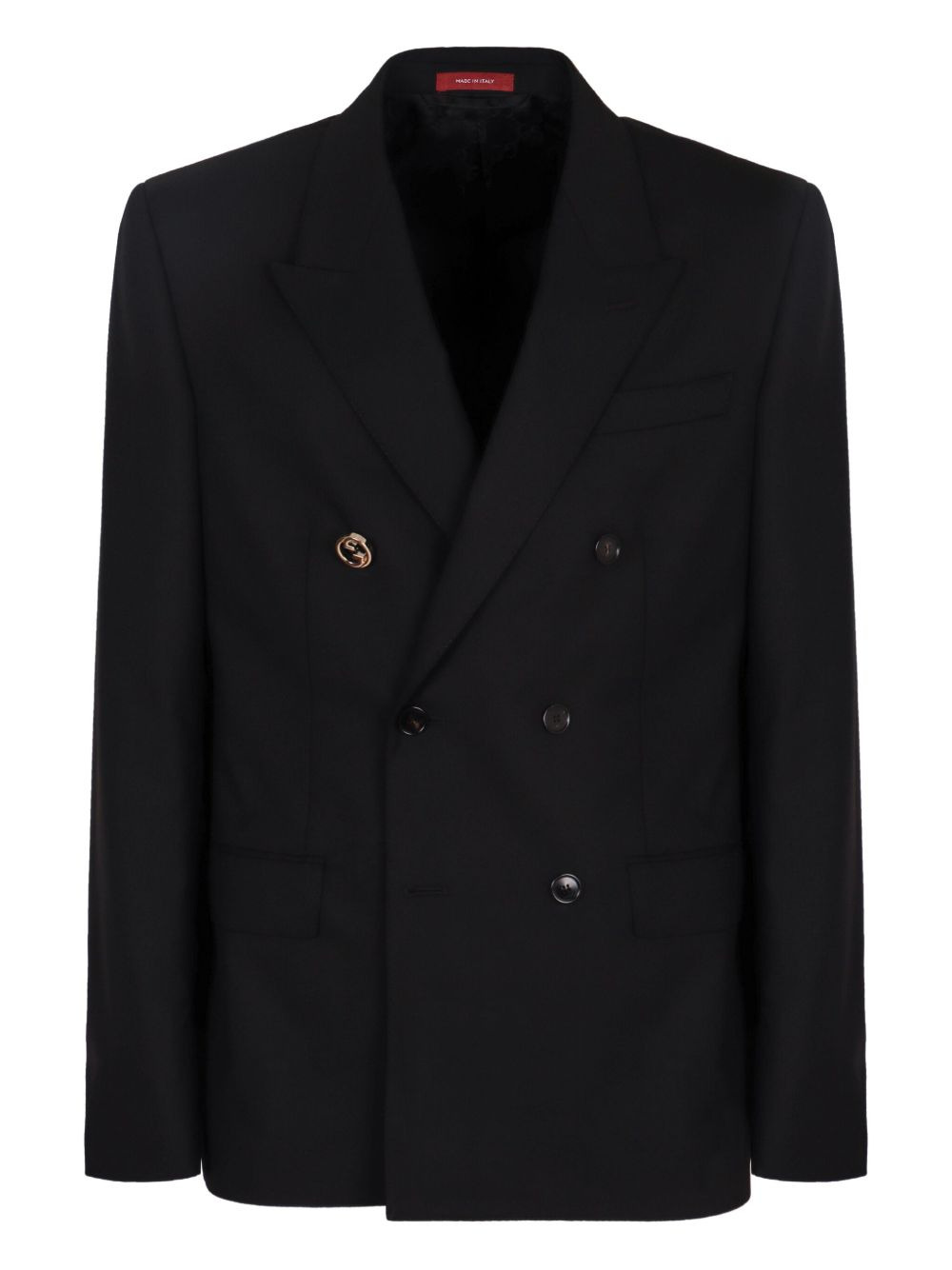 double-breasted wool jacket Highlights - Black - Double-breasted button fastening - Peak lapels - Two flap pockets - Chest jetted pocket - Central rear vent Made in Italy Composition Wool 100% Washing instructions Read Manufacturer Guidelines