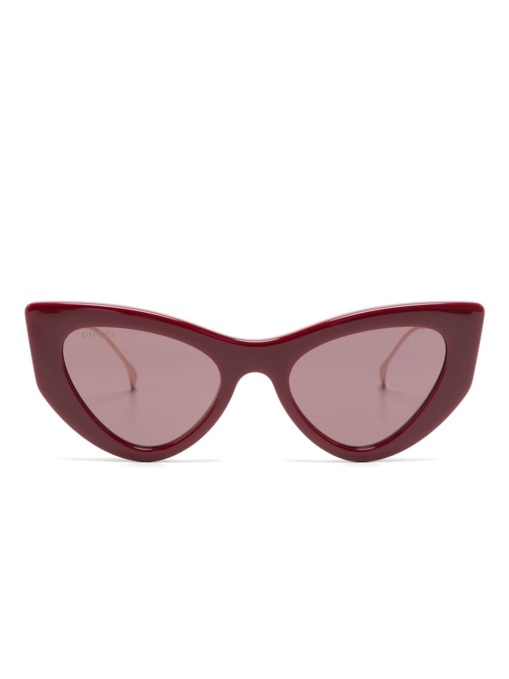 Double G cat-eye sunglasses Highlights - Cardinal red - Gold-tone - Acetate - Cat-eye frame - Pink tinted lenses - Signature double g logo - Straight arms with curved tips - These glasses come with a protective case. Made in Italy Composition Acetate 100%, Metal 100% SIZE & FIT Measurement Arm Length 4.72 in(12 cm) Bridge Width 0.78 in(2 cm) Lens Diameter 2.04 in(5.2 cm) Total Width 5.51 in(14 cm)
