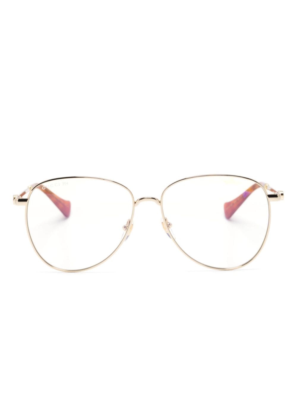 Double G logo-engraved cat-eye frame glasses Highlights - Gold-tone/amber orange - Metal/acetate - Cat-eye frame - Clear lenses - Signature double g logo-engraved arm - Nose pads - Straight arms - Curved tips - These glasses come with a protective case. - All glasses from farfetch are sold as non-prescription frames. Made in Italy Composition Metal (Other) 80%, Acetate 20% SIZE & FIT Measurement Arm Length 5.7 in(14.5 cm) Bridge Width 0.59 in(1.5 cm) Lens Diameter 2.36 in(6 cm) Total Width 5.7 in(14.5 cm)
