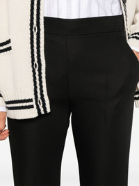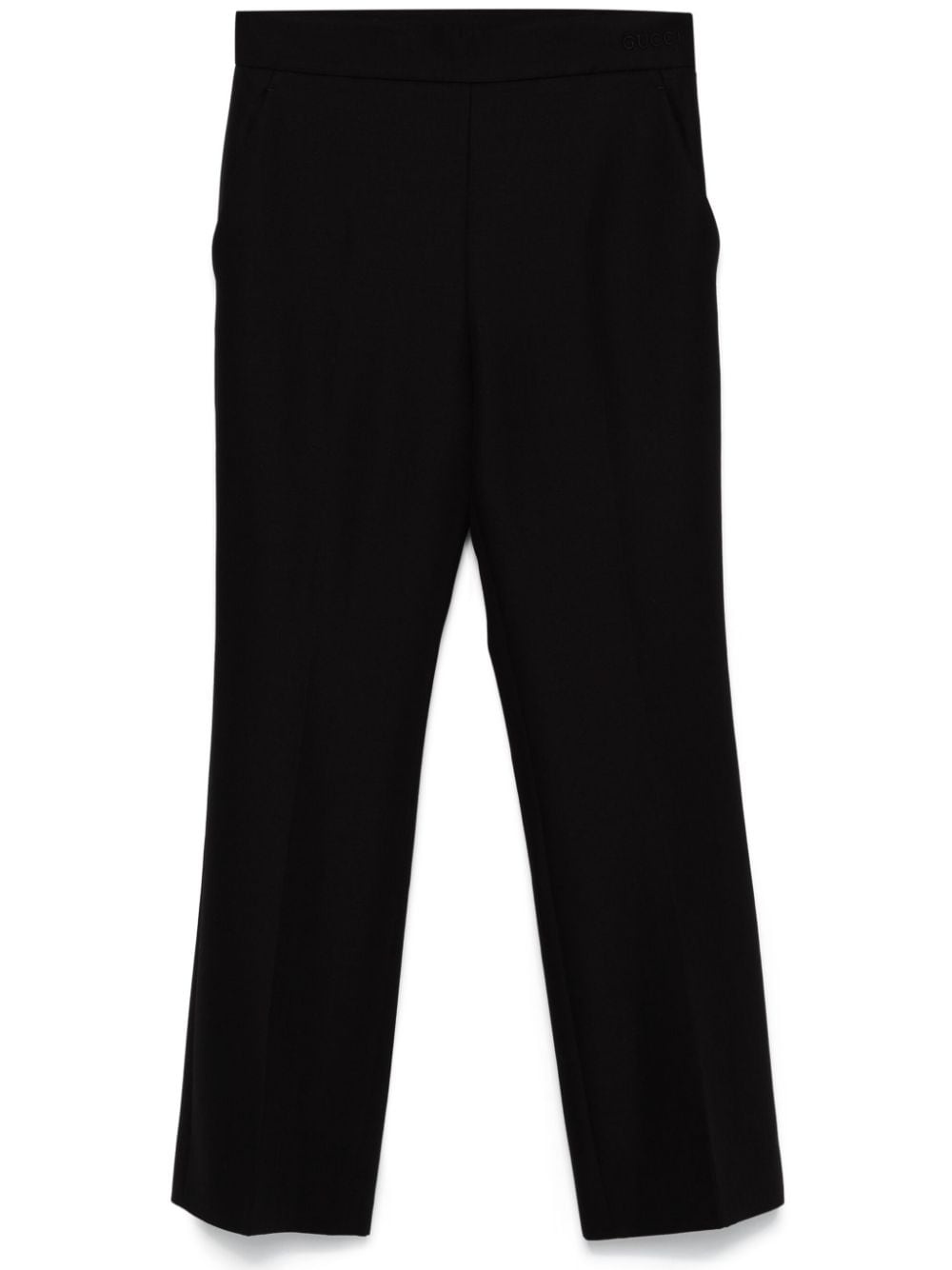 flared trousers Highlights - Black - Wool blend - Interlock twill weave - Concealed side hook and zip fastening - Mid-rise - Embroidered logo to the side - Two diagonal pockets to the sides - Pressed crease - Dart detailing - Faux pocket detail - Straight leg - Slight flare Made in Italy Composition Outer: Wool 80%, Mohair 20% Lining: Acetate 75%, Silk 25% SIZE & FIT Model measurements Height 5 ft 11 in(1.8 m) Bust/Chest 33.07 in(84 cm) Hips 37.4 in(95 cm) Waist 25.19 in(64 cm) FittingInformation Designed with a bootcut leg, these trousers allow for a close fit at the waist and with an unrestricted, comfortable fit and additional room at the calves Made from a midweight non-stretch fabric