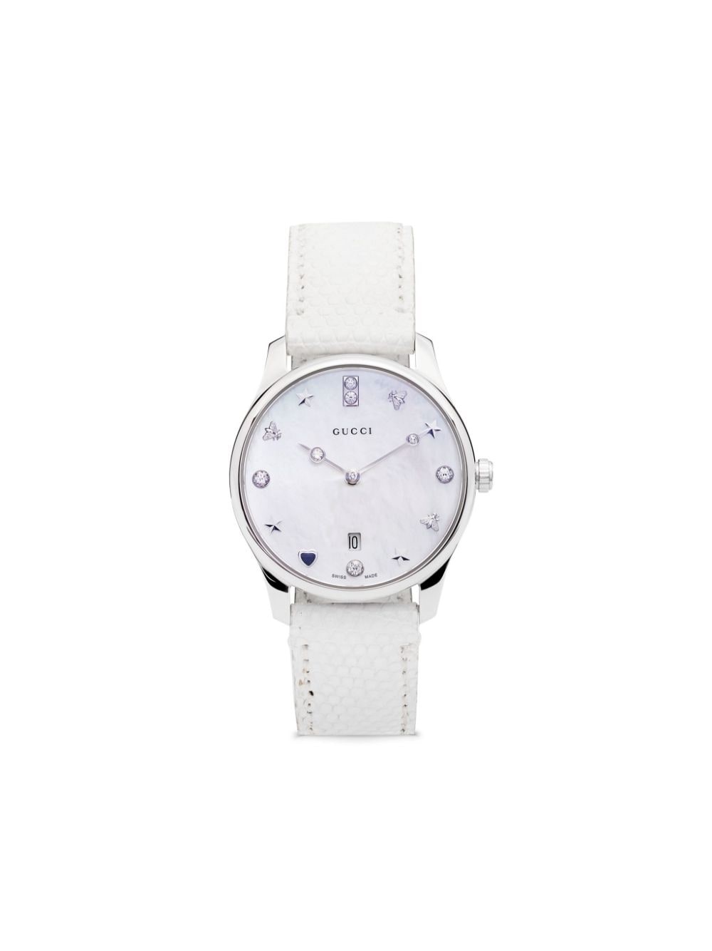 G-Timeless 29mm Highlights - 29mm - Stainless steel - Quartz movement - Round face - Mother-of-pearl dial - Signature bee motif - Star and heart index - Crystal embellishment - Crystal-embellished sword hands - Sapphire-crystal glass - Signature interlocking g logo screw-down crown - Signature bee motif engraved case back - Leather - Lizard-skin effect - Punched holes - Debossed internal logo - Logo-engraved buckle - Buckle fastening - Adjustable fit - Day-date display - Water resistance up to 50m/5 atm - This item comes with a standard one-year warranty from the brand. Imported SIZE & FIT Model measurements Height 5 ft 10 in(1.78 m) Bust/Chest 32.67 in(83 cm) Hips 35.43 in(90 cm) Waist 23.22 in(59 cm) Measurement DIAMETER 1.14 in(2.9 cm) Minimum Length 6.29 in(16 cm) Thickness 0.27 in(0.7 cm) TOTAL LENGTH 7.48 in(19 cm) WIDTH 0.78 in(2 cm)