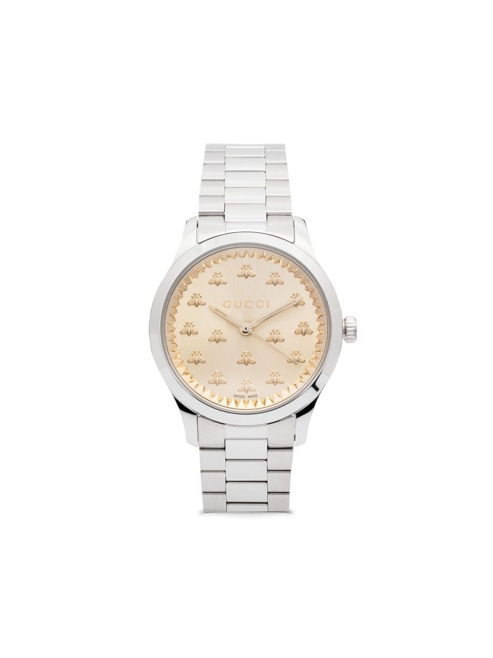 G-Timeless 32mm Highlights - 32mm - Stainless steel - Quartz movement - Round face - Gold-tone sunray-patterned dial - Signature bee motif - Gold-tone logo lettering - Sword hands - Fluted edge - Sapphire-crystal glass with anti-reflective coating - Signature interlocking g logo screw-down crown - Signature bee motif-engraved case back - Stainless steel link bracelet - Engraved logo - Push-button folding clasp - Water resistance up to 50m/5 atm - This item comes with a standard one-year warranty from the brand. Imported SIZE & FIT Model measurements Height 5 ft 10 in(1.78 m) Bust/Chest 32.67 in(83 cm) Hips 35.43 in(90 cm) Waist 23.22 in(59 cm) Measurement CIRCUMFERENCE 7.08 in(18 cm) DIAMETER 1.25 in(3.2 cm) Thickness 0.27 in(0.7 cm) WIDTH 0.78 in(2 cm)
