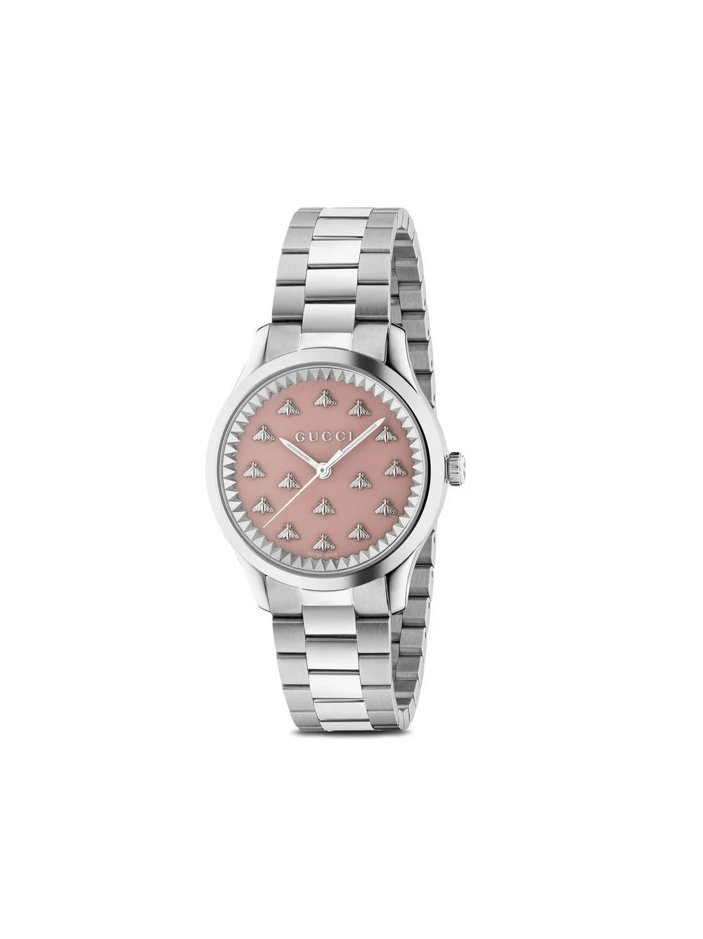G-Timeless 32mm Gucci has never failed to present its rich Italian heritage through its collections of colourful and elegant designs. A fine example is the G-Timeless Multibee 32mm which seamlessly combines both a sleek stainless steel profile with the elegant bee motif as a nod to its signature House codes. Highlights - Rose pink - Stainless steel - Round face - Quartz movement - Adjustable link bracelet - Clasp fastening - Signature bee motif - Baton hands - Screw-down crown - This item comes with a standard two-year warranty from the brand. Imported SIZE & FIT Measurement DIAMETER 1.25 in(3.2 cm)