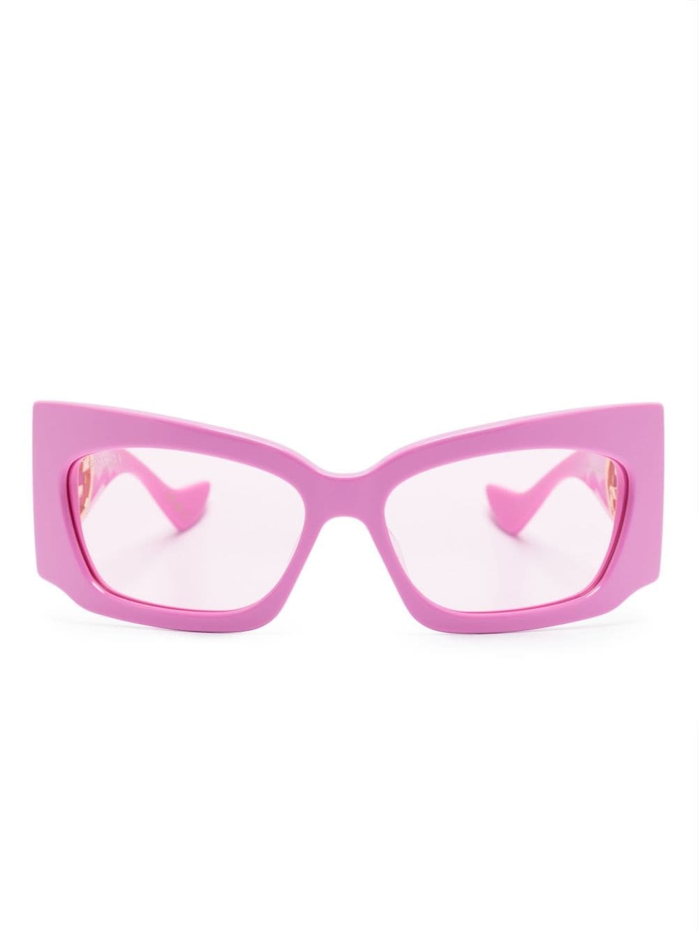 geometric-frame tinted sunglasses Highlights - Pink - Acetate - Geometric frame - Pink tinted lenses - Gold-tone logo plaque - Straight arms - Curved tips - These glasses come with a protective case. Made in Italy Composition Acetate 100% SIZE & FIT Measurement Arm Length 4.92 in(12.5 cm) Bridge Width 0.62 in(1.6 cm) Lens Diameter 2.44 in(6.2 cm) Total Width 5.51 in(14 cm)
