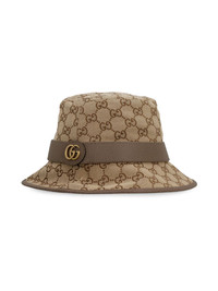 GG canvas bucket hat Crafted from monogram canvas, this fedora hat is completed by a tonal leather trim. Enhanced by the historic Double G detail on the side, both the archival references and the shape speak to the House's design narrative. Highlights - Beige/brown - Cotton - Canvas - Gg supreme canvas - Bucket body - Flat crown - Leather band - Signature double g plaque - Dropped narrow brim - Leather trim - Full lining - Internal logo patch - Antique-effect hardware - Pull-on style Made in Italy Composition Outer: CALFSKIN 100%, Cotton 71%, Polyester 29% Lining: Cotton 100%