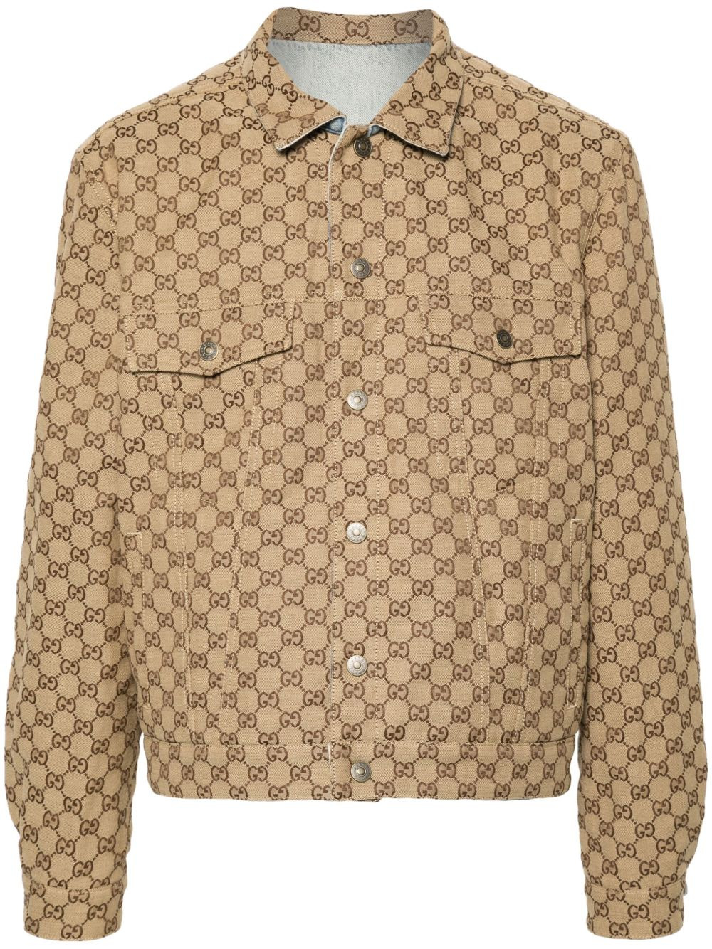 reversible denim jacket Highlights - Blue/beige/brown - Cotton - Reversible - Denim/classic gg canvas - Classic collar - Long sleeves - Buttoned cuffs - Two chest flap pockets - Two side slit pockets - Adjustable side straps - Logo patch to the rear - Straight hem - Front button fastening Made in Italy Composition Lining: Polyester 65%, Cotton 35% Outer: Cotton 100% SIZE & FIT Model measurements Height 6 ft 2 in(1.88 m) Bust/Chest 36.61 in(93 cm) Hips 35.82 in(91 cm) Waist 27.95 in(71 cm) FittingInformation Designed for a relaxed fit, this piece allows for comfort and movement when worn Made from a midweight non-stretch fabric This piece fits true to size – take your usual size Washing instructions Dry Clean Only