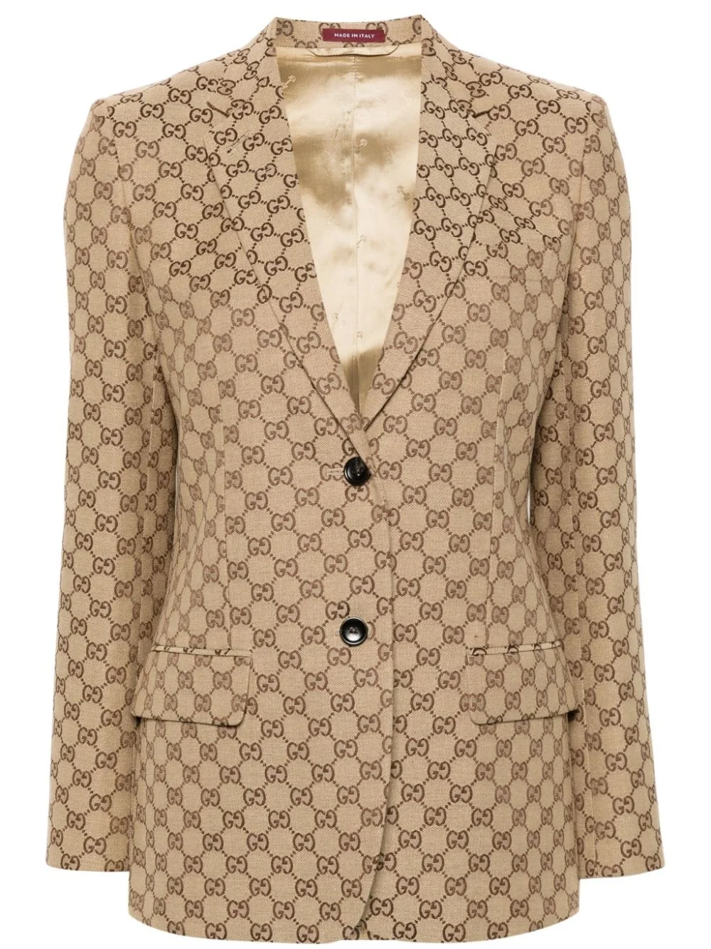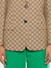GG canvas single-breasted blazer Highlights - Ebony/camel brown - Cotton blend - Original gg canvas - Notched lapels - Shoulder pads - Chest welt pocket - Long sleeves with buttoned cuffs - Dart detailing - Two side flap pockets - English rear vents - Multiple internal slip pockets - Full lining - Straight hem - Front button fastening Made in Italy Composition Outer: Cotton 70%, Polyester 30% Lining: Viscose 100% SIZE & FIT Model measurements Height 5 ft 9 in(1.76 m) Bust/Chest 31.1 in(79 cm) Hips 36.61 in(93 cm) Waist 24.8 in(63 cm) FittingInformation Designed for a slim fit that sits just away from the body offering a close yet comfortable fit The internal shoulder pads offer a structured shape Made from a midweight non-stretch fabric This piece fits true to size – take your usual size Washing instructions Dry Clean Only