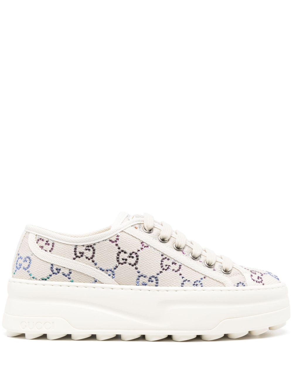 GG sneakers Highlights - Beige - Canvas - Classic gg canvas - Front lace-up fastening - Rhinestone embellishment - Logo patch at the tongue - Branded insole - Chunky rubber lug sole - Women's gucci sneakers fit large. for the most comfortable fit please select half a size down. Made in Italy Composition Lining: Fabric 100% Outer: Canvas 100% Sole: Rubber 100%