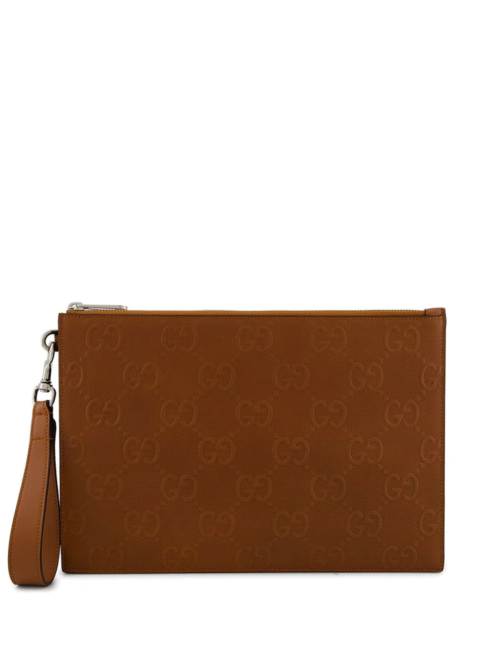 GG embossed leather pouch This leather pouch is defined by the all-over logo embossment that features the brand’s iconic monogram which is based on founder Guccio Gucci’s initials. The slim shape and alluring brown hue combine to make this piece a tastefully refined accessory. Highlights - Brown - Leather - All-over embossed logo print - Top zip fastening - Detachable wrist strap - Main compartment - This piece comes complete with a protective dust bag. Made in Italy Composition Outer: Leather 100% SIZE & FIT Measurement DEPTH 0.6 in(1.5 cm) LENGTH 8.3 in(21 cm) STRAP 4.7 in(11.9 cm) WIDTH 12 in(30.4 cm)