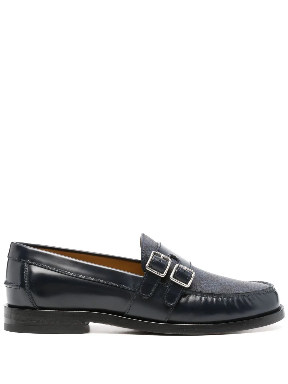 GG Supreme monk shoes Highlights - Navy blue - Canvas/leather - Panelled design - Gg supreme canvas panel - Round toe - Moc stitching - Monk strap - Branded leather insole - Flat leather sole - Logo-engraved silver-tone hardware - Double buckle fastening Made in Italy Composition Outer: Canvas 100%, Leather 100% Lining: Leather 100% Sole: Leather 100% SIZE & FIT Measurement HEEL 0.78 in(2 cm)