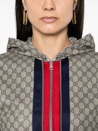 GG-logo zip-up cropped jacket Highlights - Beige/red/blue - Technical jersey - All-over gg motif - Drawstring hood - Long sleeves with elasticated cuffs - Two side zip-fastening pockets - Signature web-stripe detail - Mesh lining - Cropped - Straight hem - Front zip fastening Made in Italy Composition Outer: Polyester 55%, Cotton 45% Lining: Cotton 100%, Polyamide 100% SIZE & FIT Model measurements Height 5 ft 11 in(1.8 m) Bust/Chest 33.07 in(84 cm) Hips 37.4 in(95 cm) Waist 25.19 in(64 cm) Measurement SLEEVE LENGTH 23.62 in(60 cm) LENGTH 22.04 in(56 cm) WAIST 41.73 in(106 cm) FittingInformation Designed for a relaxed fit, this piece allows for comfort and movement when worn The internal drawstring at the hem allows for fitted preferences Made from a midweight non-stretch fabric, this piece offers minimal elasticity when worn This piece fits true to size – take your usual size Washing instructions Dry Clean Only