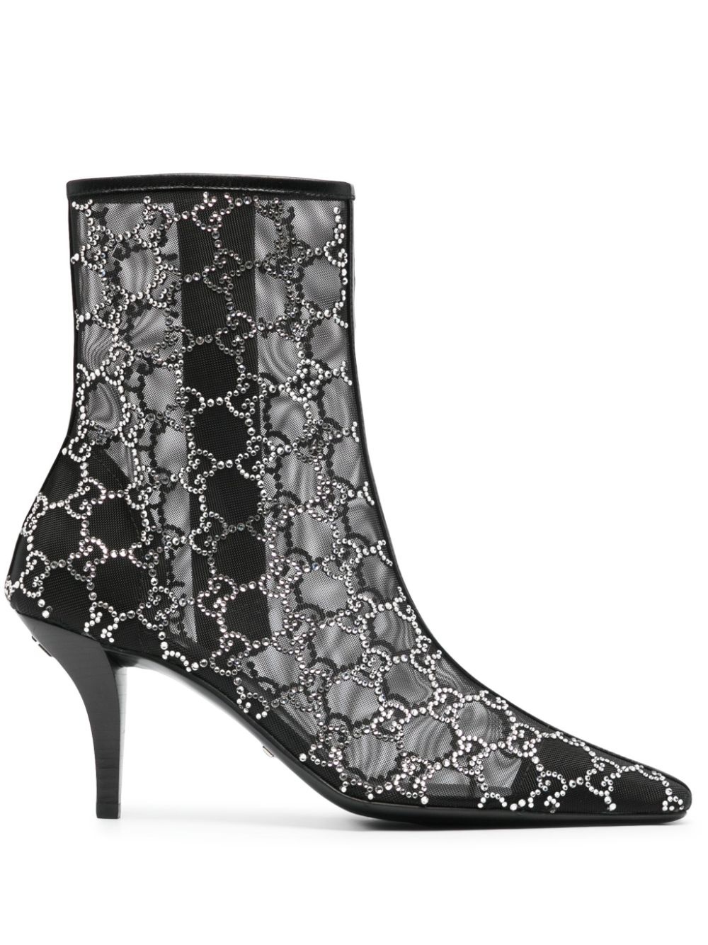 85mm GG-motif ankle boots Highlights - Black - Leather - All-over crystal embellished signature gg monogram - Transparent design - Mesh design - Pointed toe - Branded insole - Ankle-length - Logo plaque to the rear - 85mm sculpted heel - Leather sole - Side zip fastening Made in Italy Composition Outer: Crystal 100%, Mesh 100% Sole: Calf Leather 100% Lining: Calf Leather 100% SIZE & FIT Measurement HEEL 3.14 in(8 cm) CIRCUMFERENCE 9.64 in(24.5 cm) HEIGHT 6.29 in(16 cm)