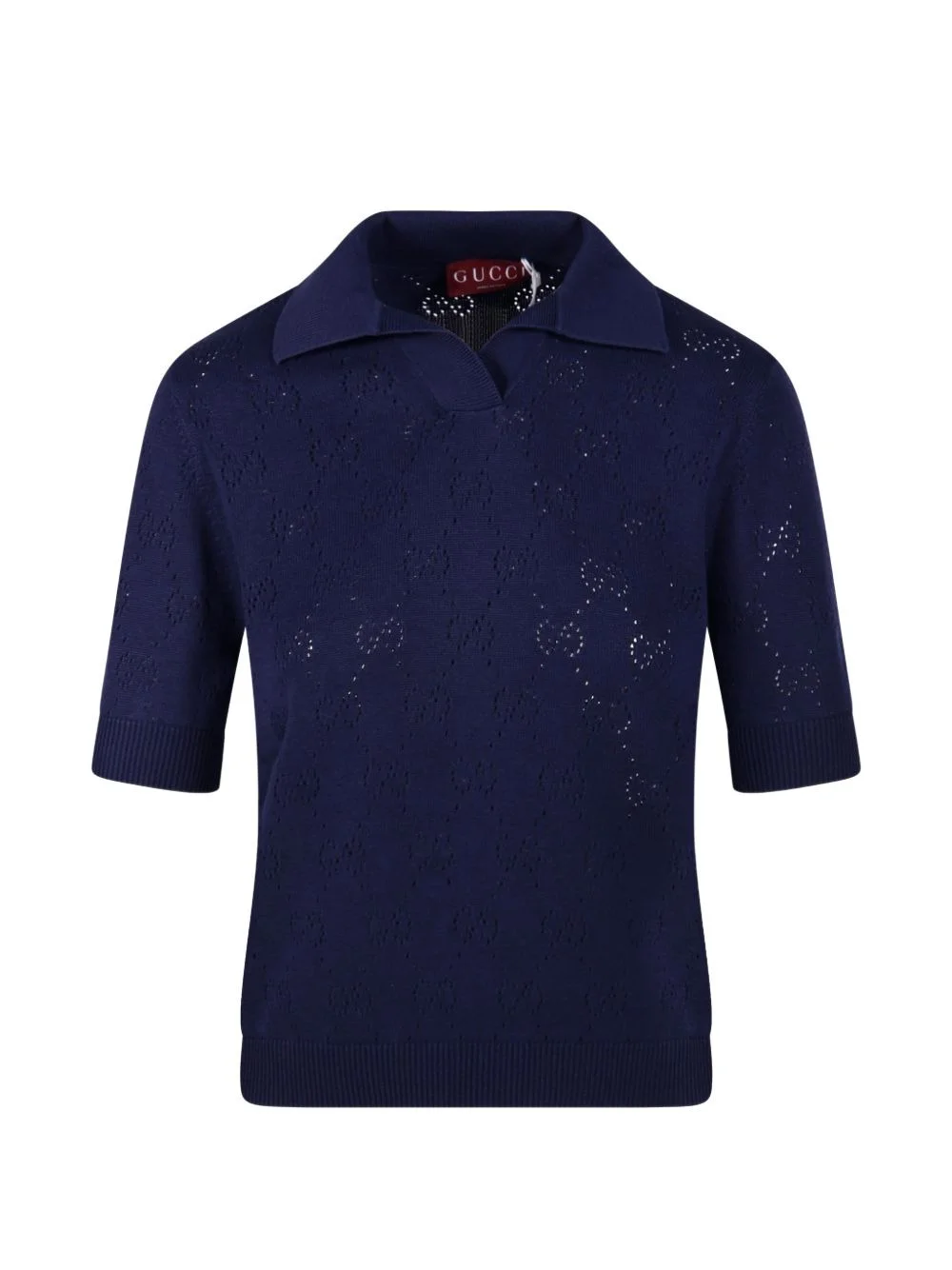 GG pointelle polo top Highlights - Blue - Polo collar - Ribbed hem - Ribbed cuffs - Short sleeves Made in Italy Composition Silk 55%, Cotton 45% Washing instructions Read Manufacturer Guidelines