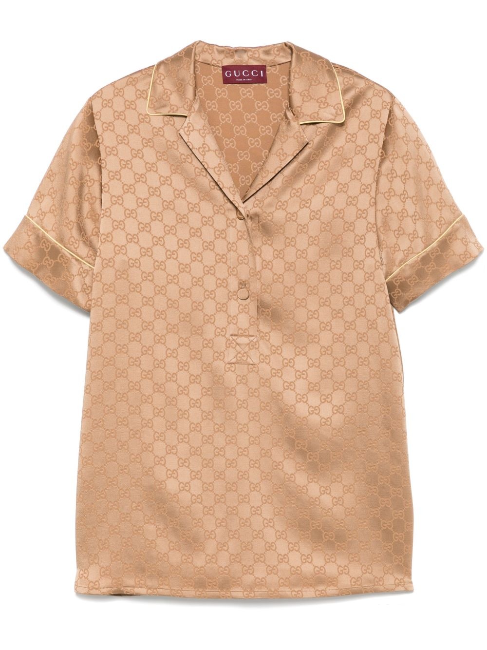 GG satin shirt Highlights - Caramel brown - Short front button fastening - Camp collar - Short sleeves - Straight hem Made in Italy Composition Outer: Viscose 55%, Silk 45% SIZE & FIT Model measurements Height 5 ft 10 in(1.78 m) Bust/Chest 33.46 in(85 cm) Hips 36.22 in(92 cm) Waist 23.22 in(59 cm) Measurement CHEST 37.79 in(96 cm) SLEEVE LENGTH 9.84 in(25 cm) HIPS 41.73 in(106 cm) LENGTH 30.31 in(77 cm) WAIST 40.15 in(102 cm) FittingInformation Designed to be unstructured, offering a loose fit throughout Made from a lightweight non-stretch fabric