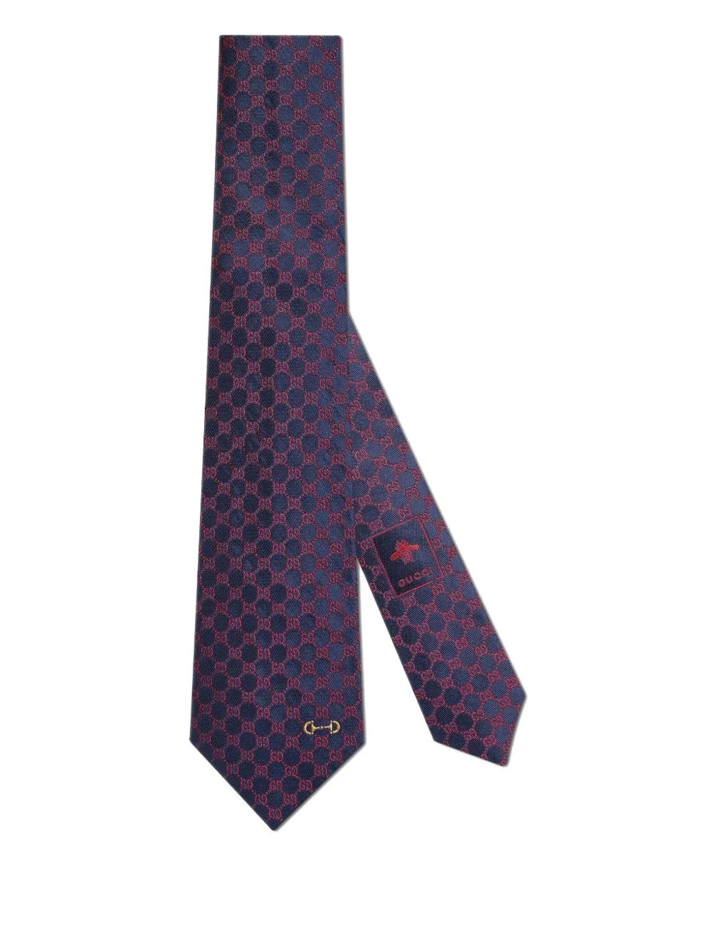 GG silk jacquard tie Highlights - Navy blue/dark red - Silk - Jacquard g monogram motif - Signature horsebit detail - Signature bee motif - Pointed tip - Adjustable fit Made in Italy Composition Lining: Cupro 60%, Silk 40% Outer: Silk 100%