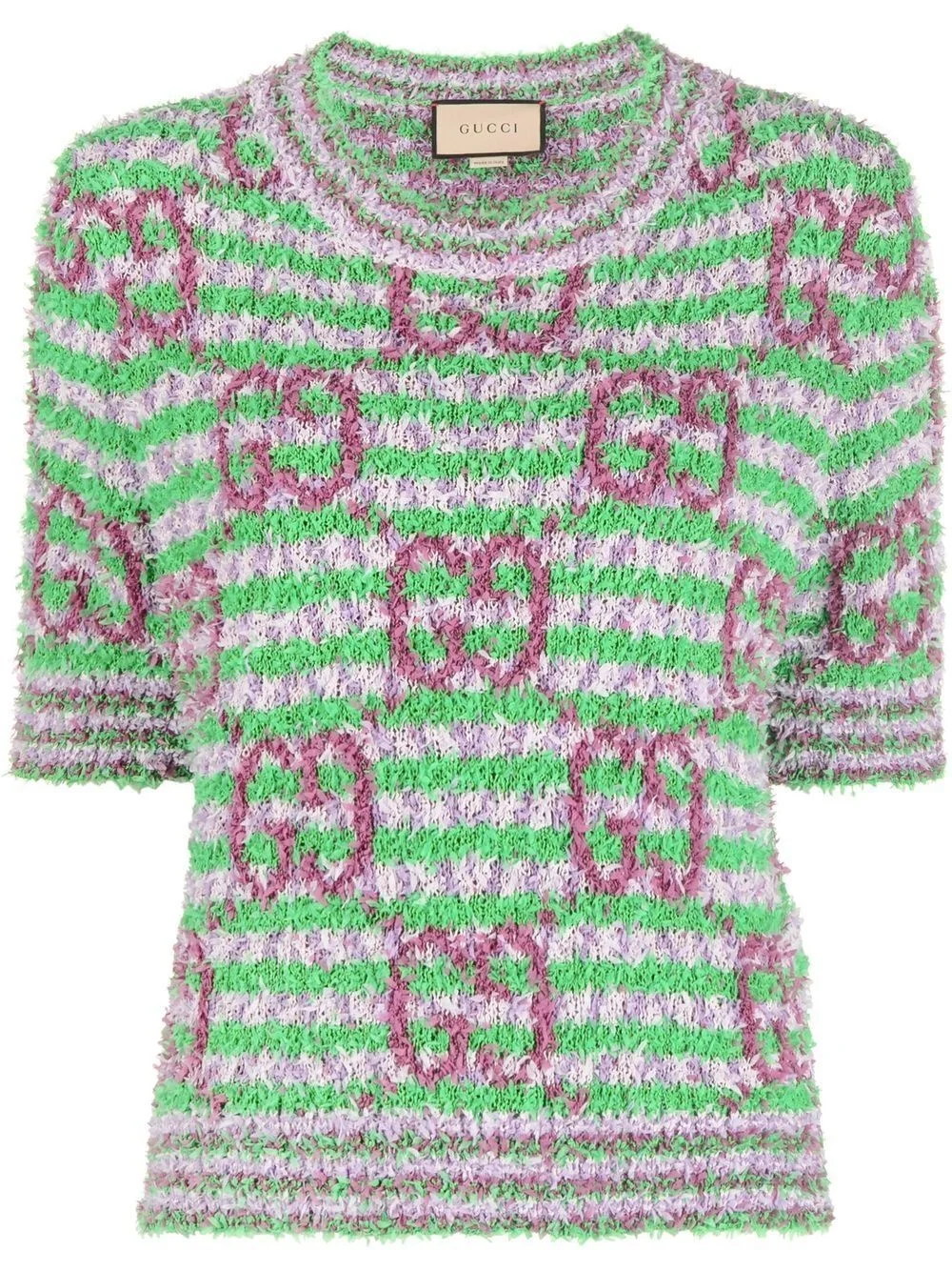 GG striped-knit top Crafted in a textured knit, this Gucci top showcases a green and purple horizontal stripe pattern which is decorated with the Jumbo GG motif for a branded finish. Made in Italy Composition Cotton 53%, Polyamide 47% SIZE & FIT Measurement SLEEVE LENGTH 9.44 in(24 cm) Shoulder Width 13.77 in(35 cm) LENGTH 18.5 in(47 cm) BUST 33.07 in(84 cm)