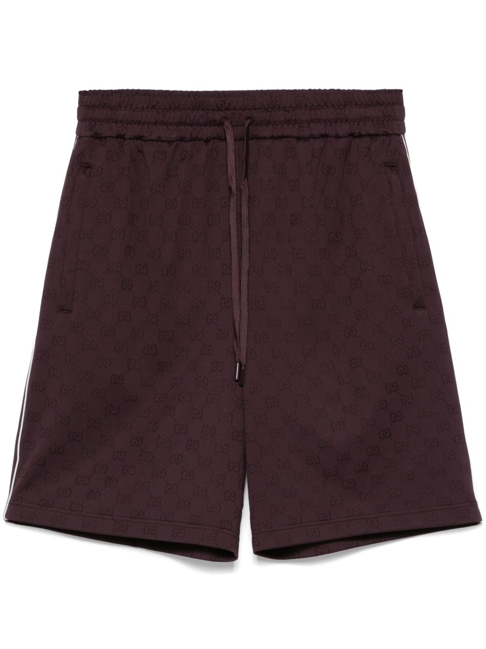 GG Supreme-jacquard shorts Highlights - Oxblood red - Elasticated drawstring waistband - Two side zip-fastening pockets - Piped-trim detailing Made in Italy Composition Outer: Polyamide 75%, Cotton 25% Lining: Cotton 100% SIZE & FIT Model measurements Height 6 ft 1 in(1.85 m) Bust/Chest 35.82 in(91 cm) Hips 37.79 in(96 cm) Waist 29.13 in(74 cm) FittingInformation Designed for relaxed fit, offering a comfortable loose fit over the leg Adjust this piece’s waistband to your preference using the drawstring Made from a midweight non-stretch fabric, this piece offers minimal elasticity when worn Washing instructions Hand Wash