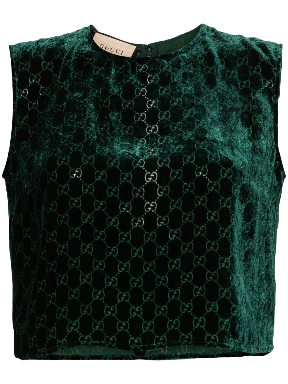 GG Supreme velvet tank top Highlights - Forest green - Velvet - Signature gg supreme jacquard - Crew neck - Sleeveless - Concealed rear zip fastening - Straight hem - Cropped Made in Italy Composition Viscose 78%, Silk 22% SIZE & FIT Model measurements Height 5 ft 10 in(1.77 m) Bust/Chest 32.28 in(82 cm) Hips 35.03 in(89 cm) Waist 25.19 in(64 cm) Measurement CHEST 34.64 in(88 cm) LENGTH 16.14 in(41 cm) WAIST 33.07 in(84 cm) FittingInformation Designed for a slim fit that sits just away from the body offering a close yet comfortable fit Made from a midweight non-stretch fabric This piece fits true to size – take your usual size Washing instructions Dry Clean Only