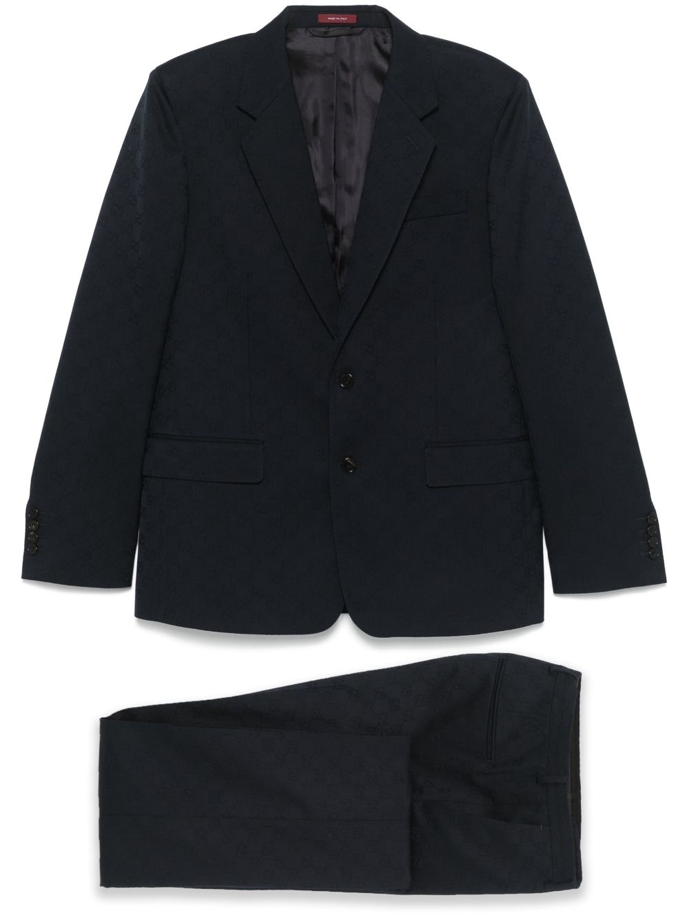 GG wool jacquard suit Highlights - Oxford blue - Front button fastening - Concealed front button, hook and zip fastening - Two side slash pockets - Two rear jetted pockets Made in Italy Composition Lining: Viscose 100%, Cotton 100% Outer: Wool 100% SIZE & FIT Model measurements Height 6 ft 1 in(1.85 m) Bust/Chest 35.82 in(91 cm) Hips 37.79 in(96 cm) Waist 29.13 in(74 cm) FittingInformation Tailored for a slim fit, offering a comfortable fit that sits just away from the body The unfinished hems allow for the length to be altered Made from a midweight non-stretch fabric