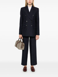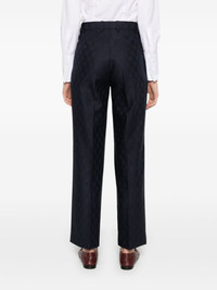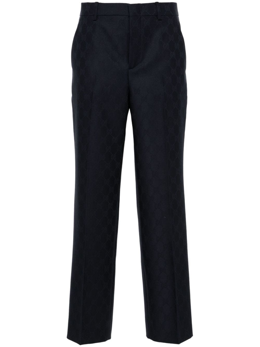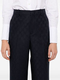 GG wool trousers Highlights - Oxford blue - Wool - Twill weave - Signature gg jacquard - Concealed front button, hook and zip fastening - Mid-rise - Belt loops - Two side slash pockets - Pressed crease - Tailored cut - Cropped tapered leg Made in Italy Composition Lining: Cotton 100% Outer: Wool 100% SIZE & FIT Model measurements Height 5 ft 10 in(1.77 m) Bust/Chest 33.07 in(84 cm) Hips 34.64 in(88 cm) Waist 23.22 in(59 cm) FittingInformation Designed for a straight-leg fit, these trousers allow for a close fit at the waist and an unrestricted, comfortable fit over the leg Made from a midweight non-stretch fabric