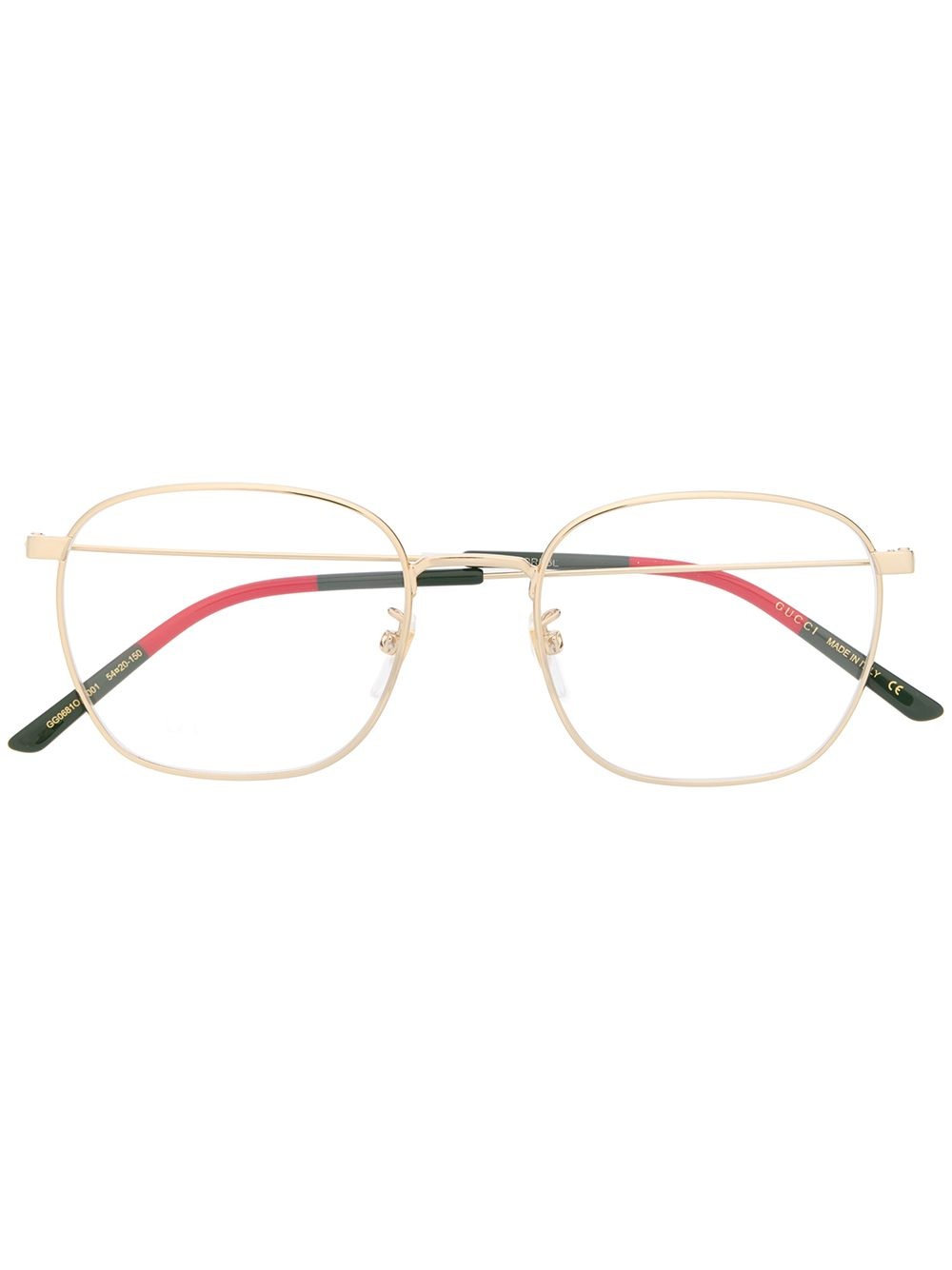 GG0681O soft square-frame glasses Comfort is key - but a little style never hurt anyone. Designed with soft-square frames and decorated with the brand's signature green and red Web detail, these gold-tone metal glasses from Gucci Eyewear will complement your looks with a refined touch. Featuring nose pads, a logo at the temple and straight arms with curved tips. This item comes with a protective case. Made in Italy Composition Acetate 100%, Metal (Other) 100% SIZE & FIT Measurement Arm Length 5.9 in(15 cm) Bridge Width 0.78 in(2 cm) Lens Diameter 2.12 in(5.4 cm) Total Width 5.43 in(13.8 cm)