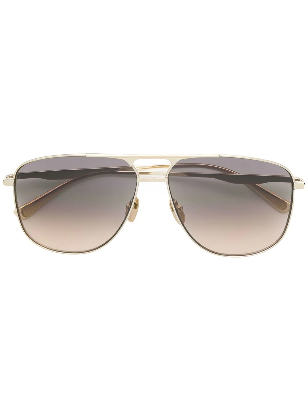 pilot-frame sunglasses Highlights - Gold-tone - Metal - Pilot frame - Gradient lenses - Double bridge - Nose pads - Straight arms - Curved tips - These glasses come with a protective case. Imported Composition Metal (Other) 100% SIZE & FIT Measurement Bridge Width 0.51 in(1.3 cm) Lens Diameter 2.36 in(6 cm) Total Width 5.62 in(14.3 cm) Arm Length 5.7 in(14.5 cm)