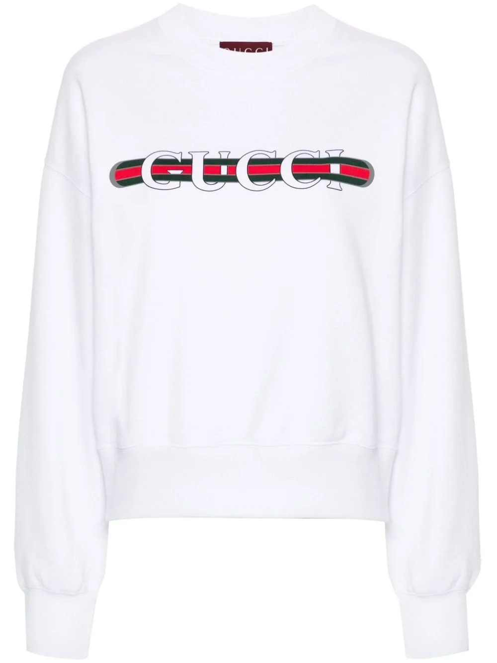 Gucci Web-print sweatshirt Highlights - White - Cotton - Jersey texture - Gucci web print to the front - Ribbed trim - Crew neck - Long sleeves - Straight hem Made in Italy Composition Cotton 100% SIZE & FIT Model measurements Height 5 ft 9 in(1.75 m) Bust/Chest 31.1 in(79 cm) Hips 36.22 in(92 cm) Waist 25.19 in(64 cm) FittingInformation Designed to be unstructured, offering a loose fit throughout Made from a midweight non-stretch fabric, this piece offers minimal elasticity when worn This piece fits true to size – take your usual size