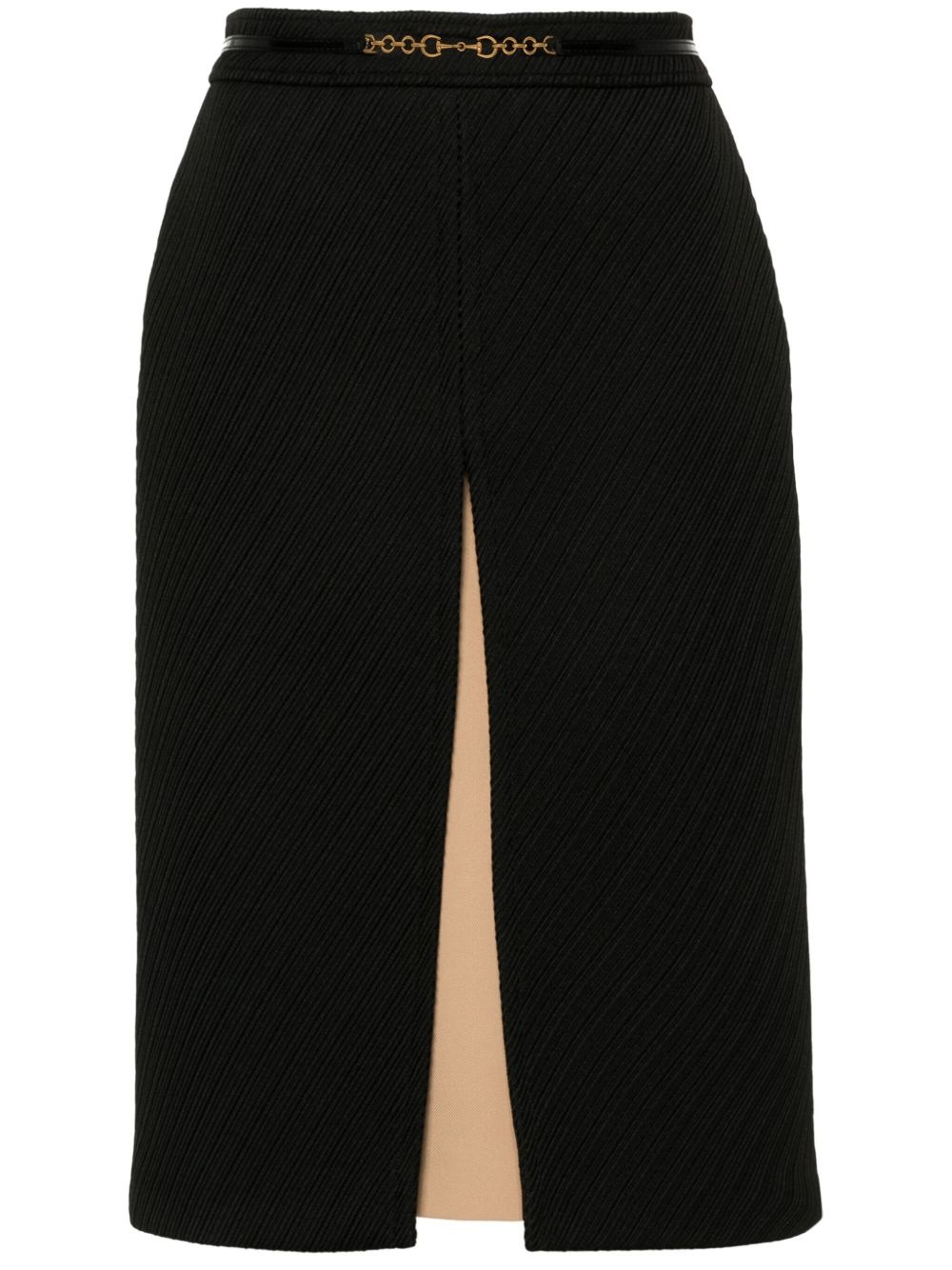 horsebit-chain striped skirt Highlights - Black - Wool - Leather trim - Diagonal stripe pattern - Signature horsebit detail - Gold-tone hardware - High waist - Concealed rear zip fastening - Front slit - Straight hem Made in Italy Composition Outer: Leather 100%, Wool 100%, Polyester 88%, Polyamide 12% Lining: Viscose 100% SIZE & FIT Model measurements Height 5 ft 11 in(1.8 m) Bust/Chest 32.67 in(83 cm) Hips 36.22 in(92 cm) Waist 24.4 in(62 cm) FittingInformation This midi-length skirt is intended to be worn high on the waist Made from a midweight non-stretch fabric This piece fits true to size – take your usual size Washing instructions Dry Clean Only