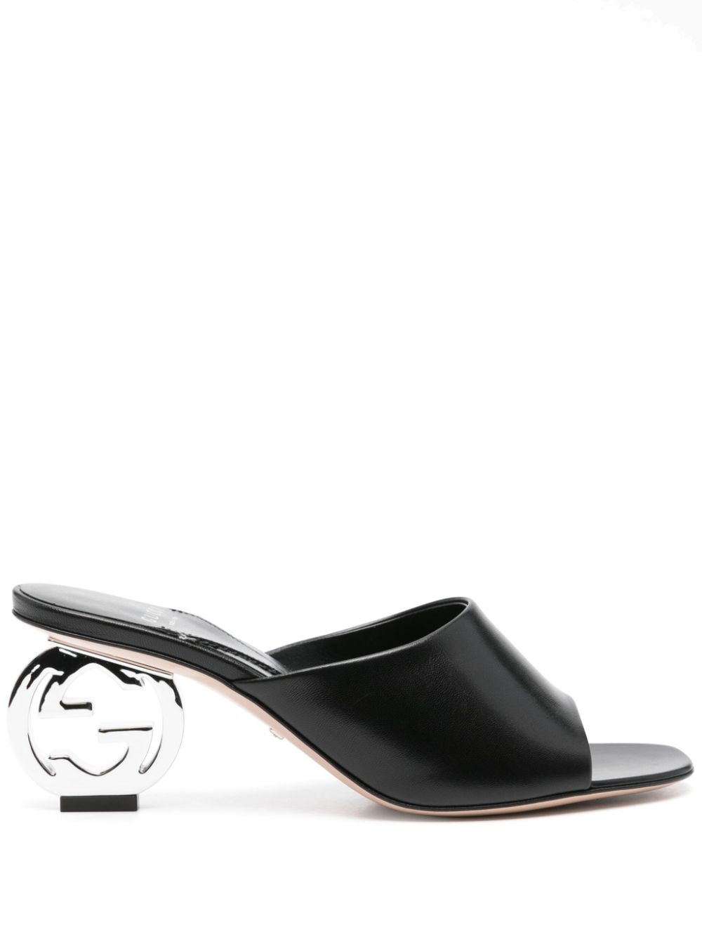 70 mm Interlocking G-heel mules Aldo Gucci debuted the Interlocking G logo in the ‘80s as homage to his father and founder Guccio. It’s since evolved into the mirrored version that forms the silver-tone metal heel of these black leather mules. Highlights - Black - Calf leather - Slip-on style - 70mm mid sculpted heel - Silver-tone interlocking g-shaped heel - Open toe - Branded footbed Made in Italy Composition Sole: Calf Leather 100%, Rubber 100% Lining: Calf Leather 100% Outer: Calf Leather 100%, Metal 100% SIZE & FIT Measurement HEEL 2.75 in(7 cm)