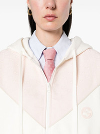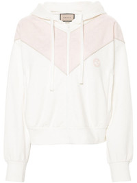 Interlocking G-patch cotton sweatshirt Highlights - White/light pink - Cotton - Jersey texture - Panelled design - Piped-trim detailing - Drawstring hood - Interlocking g embroidered patch - Embroidered gg detail - Long sleeves - Ribbed cuffs and hem - Two side zip-fastening pockets - Straight hem - Front zip fastening Made in Italy Composition Cotton 100%, Polyester 100% SIZE & FIT FittingInformation Designed for a relaxed fit, this piece allows for comfort and movement when worn Made from a midweight non-stretch fabric, this piece offers minimal elasticity when worn This piece fits true to size – take your usual size