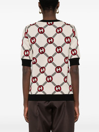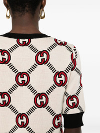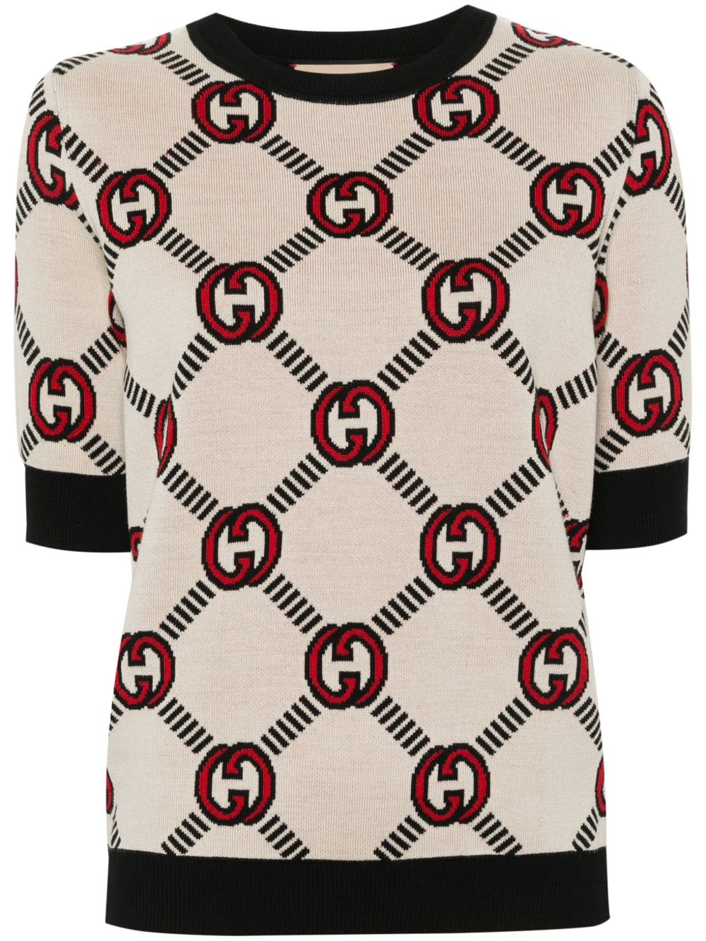 Interlocking G reversible sweater Gucci's jumper is decorated with the unmistakable Interlocking G logo in a jacquard iteration. Crafted from a wool blend, this short-sleeve jumper is defined by its reversible design, showcasing a different colour scheme of the signature motif on each side. Highlights - White/black/red - Wool blend - Reversible - Knitted construction - Signature interlocking g logo - Crew neck - Short sleeves - Ribbed cuffs - Ribbed hem Made in Italy Composition Wool 98%, Elastane 1%, Polyamide 1% SIZE & FIT Model measurements Height 5 ft 11 in(1.8 m) Bust/Chest 32.67 in(83 cm) Hips 36.22 in(92 cm) Waist 24.4 in(62 cm) FittingInformation Designed for a relaxed fit, this piece allows for comfort and movement when worn The ribbed hem offers a close, comfortable fit Made with a midweight knit, this piece offers some stretch This piece fits true to size – take your usual size Measurement BUST 33.85 in(86 cm) Washing instructions Dry Clean Only