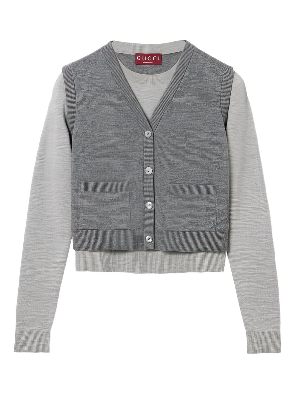 layered top Highlights - Grey - V-neck - Button fastening - Two front pockets - Ribbed hem - Long sleeves Made in Italy Composition Viscose 51%, Polyamide 30%, Wool 18%, Elastane 1% Washing instructions Read Manufacturer Guidelines