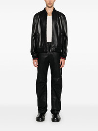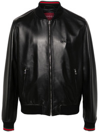 logo-embroidered bomber jacket Highlights - Black - Calf leather - Smooth grain - Embroidered logo to the front - Baseball collar - Front zip fastening - Long sleeves - Ribbed cuffs and hem - Front zip fastening pockets - Full lining Made in Italy Composition Outer: Calf Leather 100%, Polyester 100%, Wool 95%, Polyamide 4%, Elastane 1% Lining: Viscose 100% SIZE & FIT Model measurements Height 6 ft 2 in(1.87 m) Bust/Chest 36.22 in(92 cm) Hips 35.43 in(90 cm) Waist 29.13 in(74 cm) FittingInformation Designed for a relaxed fit, this piece allows for comfort and movement when worn The ribbed hem offers a close, comfortable fit Soft leather has a supple and smooth construction offering some flexibility This piece fits true to size – take your usual size