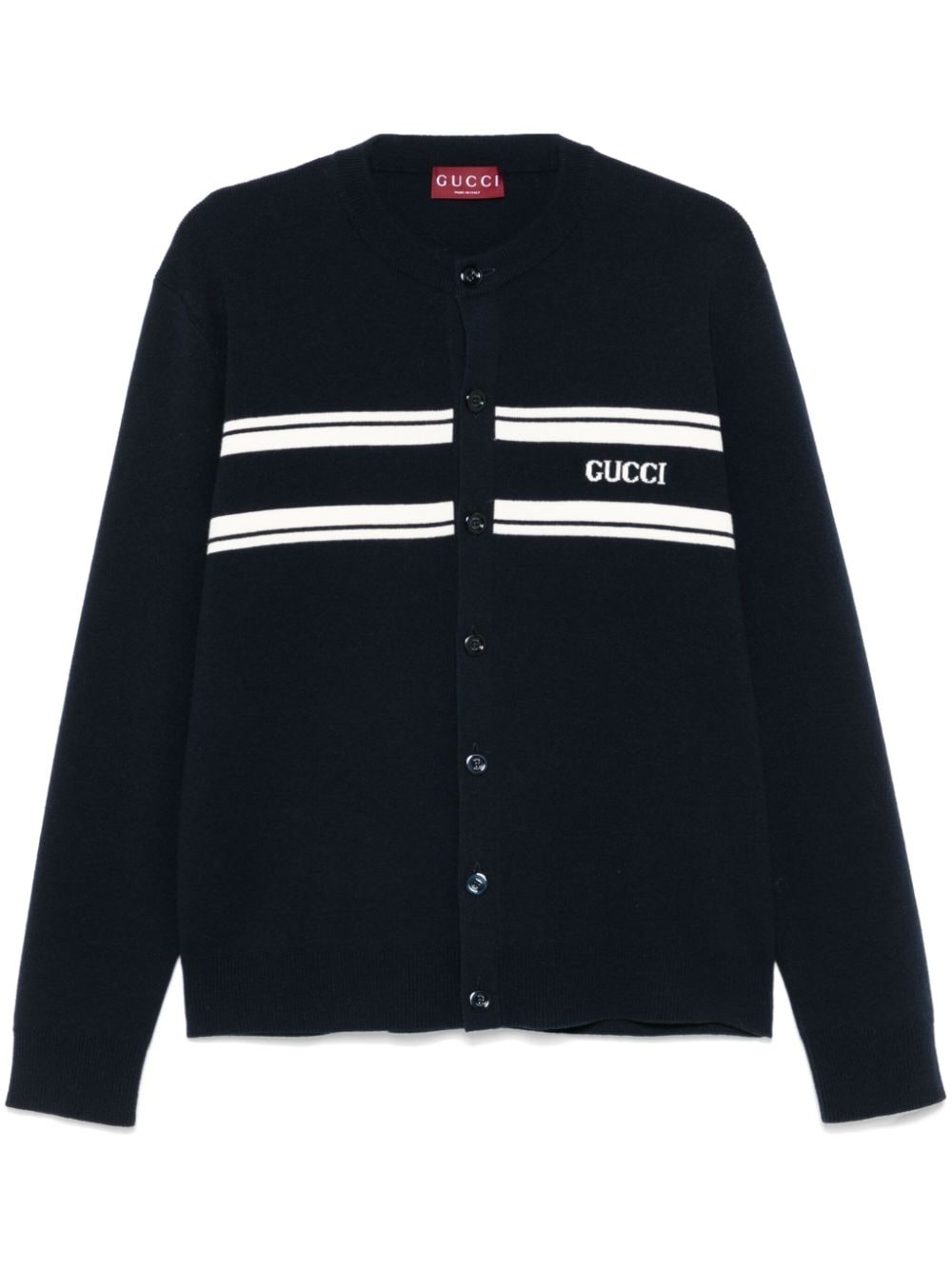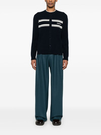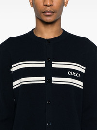 logo-intarsia cardigan Highlights - Navy blue - Wool-cashmere blend - Knitted construction - Intarsia-knit logo - Front button placket - Crew neck - Drop shoulder - Long sleeves - Stripe detailing - Ribbed cuffs and hem Made in Italy Composition Wool 70%, Cashmere 30% SIZE & FIT Model measurements Height 6 ft 2 in(1.87 m) Bust/Chest 36.22 in(92 cm) Hips 37 in(94 cm) Waist 27.95 in(71 cm) Measurement CHEST 44.09 in(112 cm) SLEEVE LENGTH 35.03 in(89 cm) Shoulder Width 18.11 in(46 cm) FittingInformation Designed for a relaxed fit, this piece allows for comfort and movement when worn The ribbed hem offers a close, comfortable fit Made with a midweight knit, this piece offers some stretch