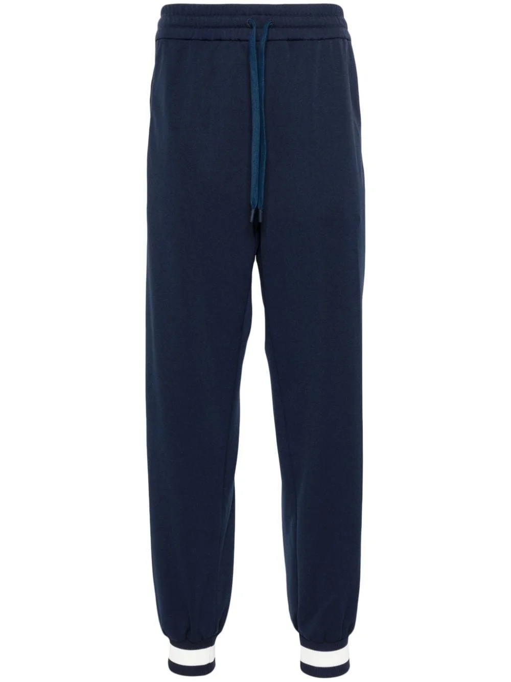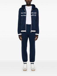 logo-print track pants Highlights - Navy blue - Cotton - Technical jersey - Side stripe detailing - Two side welt pockets - Logo print to the side - Full-length - Striped ribbed ankles - Rear patch pocket - Tapered leg - Elasticated drawstring waistband Made in Italy Composition Lining: Cotton 100% SIZE & FIT Model measurements Height 6 ft 2 in(1.87 m) Bust/Chest 36.41 in(92.5 cm) Hips 37 in(94 cm) Waist 29.52 in(75 cm) Measurement FRONT RISE 12.59 in(32 cm) INSIDE LEG 30.31 in(77 cm) WAIST 29.13 in(74 cm) FittingInformation Designed for a relaxed tapered leg, allowing a comfortable loose fit above the knee with a closer fit towards the calves The elasticated waist allows for a comfortable fit Made from a midweight non-stretch fabric, this piece offers minimal elasticity when worn This piece fits true to size – take your usual size