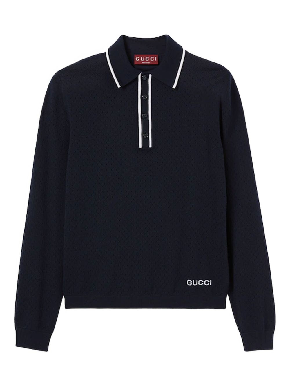 long-sleeve knitted polo shirt Highlights - Navy blue - Long sleeves - Knitted texture - Polo collar - Button placket - Embroidered logo Made in Italy Composition Wool 100% Washing instructions Read Manufacturer Guidelines
