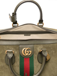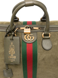 medium Savoy duffle bag Highlights - Olive green - Web stripe detail - Two top handles - Padlock fastening - Double gg logo plaque - Top zip fastening Made in Italy Composition Cotton 100% SIZE & FIT Measurement DEPTH 3.85 in(9.8 cm) HEIGHT 4.48 in(11.4 cm) WIDTH 6.81 in(17.3 cm)