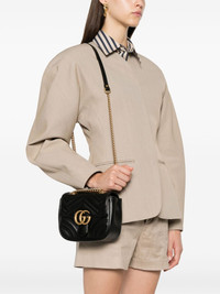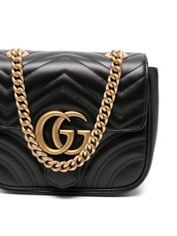 mini GG Marmont shoulder bag Gucci scales down its signature GG Marmont shoulder bag to mini proportions. This black iteration features chevron matelasse quilting and is topped with the brand's Double G gold-tone logo plaque. Highlights - Black - Calf leather - Signature marmont quilting - Signature double g logo - Foldover top - Sliding chain-link shoulder strap - Main compartment - Internal slip pocket - Debossed internal logo - Full lining - Gold-tone hardware - Spring-ring fastening - This piece comes complete with a protective dust bag. Made in Italy Composition Outer: Leather 100% SIZE & FIT Model measurements Height 5 ft 10 in(1.78 m) Bust/Chest 33.85 in(86 cm) Hips 36.61 in(93 cm) Waist 26.77 in(68 cm) Measurement DEPTH 3.14 in(8 cm) HEIGHT 5.9 in(15 cm) WIDTH 7.08 in(18 cm) STRAP 46.85 in(119 cm)