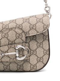 mini Horsebit 1955 shoulder bag Undeniably Gucci, this mini Horsebit 1955 shoulder bag is awash with the maison's iconic GG Supreme canvas for instant recognition. Its unique asymmetric silhouette benefits from two detachable straps that allow for custom styling, and is adorned with the familiar equestrian-inspired hardware on the front that lends the accessory its name. Highlights - Beige/brown - Canvas/calf leather - Asymmetric design - Gg supreme canvas - Signature horsebit detail - Detachable shoulder strap - Detachable chain-link shoulder strap - Front flap closure - Main compartment - Internal logo patch - Canvas lining - Silver-tone hardware Made in Italy Composition Outer: Canvas 100%, Calf Leather 100% SIZE & FIT Model measurements Height 5 ft 9 in(1.75 m) Bust/Chest 34.64 in(88 cm) Hips 36.61 in(93 cm) Waist 26.37 in(67 cm) Measurement DEPTH 2.36 in(6 cm) HEIGHT 5.11 in(13 cm) STRAP 24.4 in(62 cm) WIDTH 7.87 in(20 cm) HANDLE 6.29 in(16 cm)