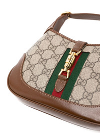mini Jackie 1961 shoulder bag A mini size of the Gucci Jackie 1961 shoulder bag, this piece boasts a GG Supreme canvas construction with leather detailing. The iconic branding continues with a green and red Web stripe to the front. Highlights - Beige/brown - Gg supreme canvas - Signature web detailing - Leather trim - Snap-lock closure - Adjustable detachable shoulder strap - Main compartment - Internal card slot - Debossed internal logo - Full lining - Gold-tone hardware - This piece comes complete with a protective dust bag. Made in Italy Composition Outer: Canvas 100% Trims: Leather 100% Lining: Suede 100%, Microfibre 100% SIZE & FIT Model measurements Height 5 ft 9 in(1.76 m) Bust/Chest 31.88 in(81 cm) Hips 35.43 in(90 cm) Waist 24.8 in(63 cm) Measurement DEPTH 1.2 in(3 cm) HEIGHT 5.1 in(12.9 cm) STRAP 49.21 in(125 cm) WIDTH 7.48 in(19 cm)