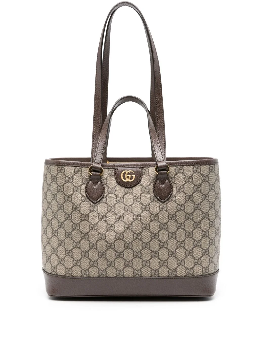 small Ophidia tote bag Boasting key elements of the house's archives, Gucci's GG Supreme canvas defines the construction of this Ophidia tote bag. Presented in a mini iteration, it's highlighted by the signature Web Stripe and a Double G logo. Highlights - Beige/coffee brown - Gg supreme canvas - Leather trim - Two flat top handles - Two flat shoulder straps - Open top - Signature double g logo - Main compartment - Internal logo patch - Full lining - This piece comes complete with a protective dust bag. Made in Italy Composition Outer: Canvas 100%, Calf Leather 100% Lining: Cotton 100% SIZE & FIT Model measurements Height 5 ft 9 in(1.76 m) Bust/Chest 31.88 in(81 cm) Hips 35.43 in(90 cm) Waist 24.8 in(63 cm) Measurement DEPTH 4.72 in(12 cm) HANDLE 5.11 in(13 cm) HEIGHT 9.44 in(24 cm) STRAP 24.8 in(63 cm) WIDTH 13.38 in(34 cm)