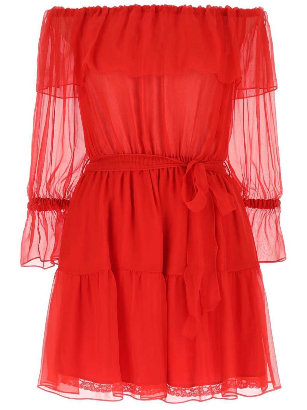 off-shoulder silk minidress There aren't many designs as perfectly suited to cocktail dates than this off-shoulder mini dress from Gucci. Defined by its opulent silk chiffon construction, delicate ruffles and a tied waist. Highlights - Rose red - Silk - Chiffon crepe - Ruffled detailing - Detachable waist belt - Off-shoulder - Three-quarter length puff sleeves with flared cuffs - Elasticated waistband - Flared skirt - Straight hem - Thigh-length Made in Italy Composition Silk 100%, Polyamide 100% SIZE & FIT Measurement SLEEVE LENGTH 15.35 in(39 cm) LENGTH 29.13 in(74 cm) WAIST 25.19 in(64 cm) BUST 29.92 in(76 cm) FittingInformation Designed for a close fit at the chest and waist with a loose fit at the hip The elasticated shoulders offer movement and a comfortable fit Made from a lightweight non-stretch fabric This piece fits true to size – take your usual size