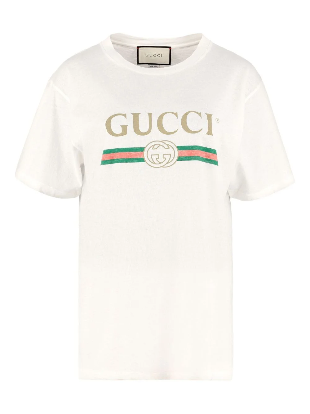 logo-print cotton T-shirt Update your basics with this white cotton oversized T-shirt from Gucci. Boasting a logo print to the chest with a weathered look and an embroidered flower to the back, this short-sleeved piece has small tears around the neck for a worn effect. The perfect piece to elevate your casual look. Rightfully so, we might add. Highlights - White - Cotton - Ripped detailing - Signature double g logo - Signature web detailing - Logo print to the front - Round neck - Short sleeves - Straight hem - As an intentional element of the design, this piece features prints or details that may crack, peel or develop a distressed effect over time due to their nature and construction. Made in Italy Composition Cotton 100% SIZE & FIT FittingInformation Designed for a relaxed fit, this piece allows for comfort and movement when worn Made from a midweight non-stretch fabric, this piece offers minimal elasticity when worn This piece fits true to size – take your usual size Washing instructions Hand Wash