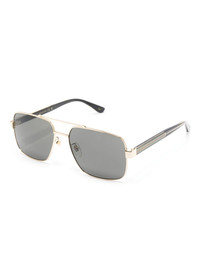 Web-arms sunglasses Take to the skies in style with these pilot frames from Gucci Eyewear. With tinted lenses, this pair is ready to fly high and bring a whole new meaning to the phrase 'high fashion'. The cockpit calls. Highlights - Gold-tone/black - Metal - Polished finish - Pilot frame - Double bridge - Uv-protective lenses - Grey tinted lenses - Lens decal - Nose pads - Signature web-stripe trim - Straight arms - Curved tips - These glasses come with a protective case. Imported Composition Metal (Other) 100% SIZE & FIT Measurement Arm Length 5.7 in(14.5 cm) Bridge Width 0.66 in(1.7 cm) Lens Diameter 2.36 in(6 cm) Total Width 5.82 in(14.8 cm)